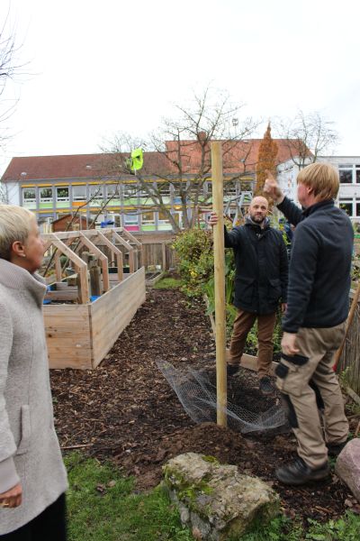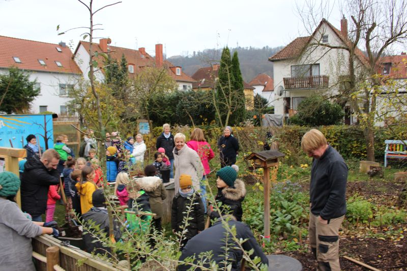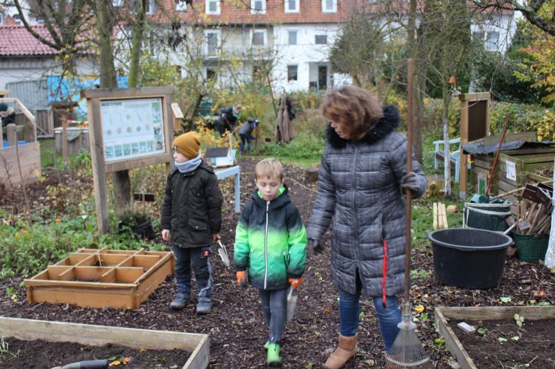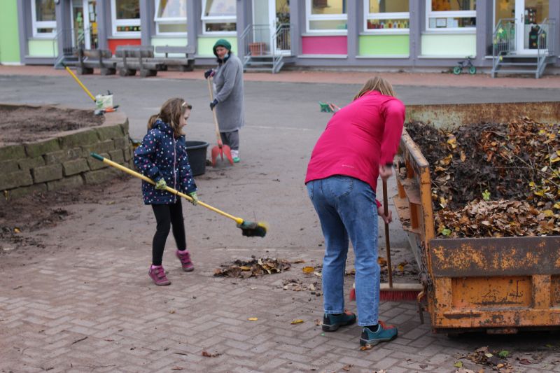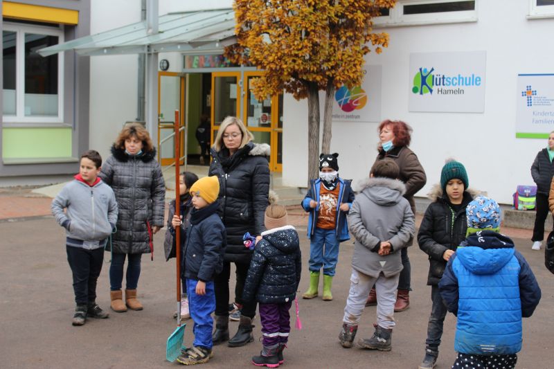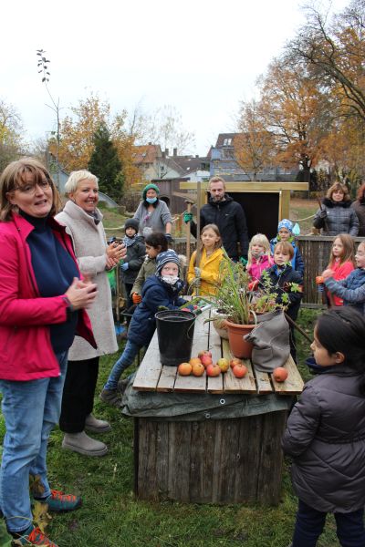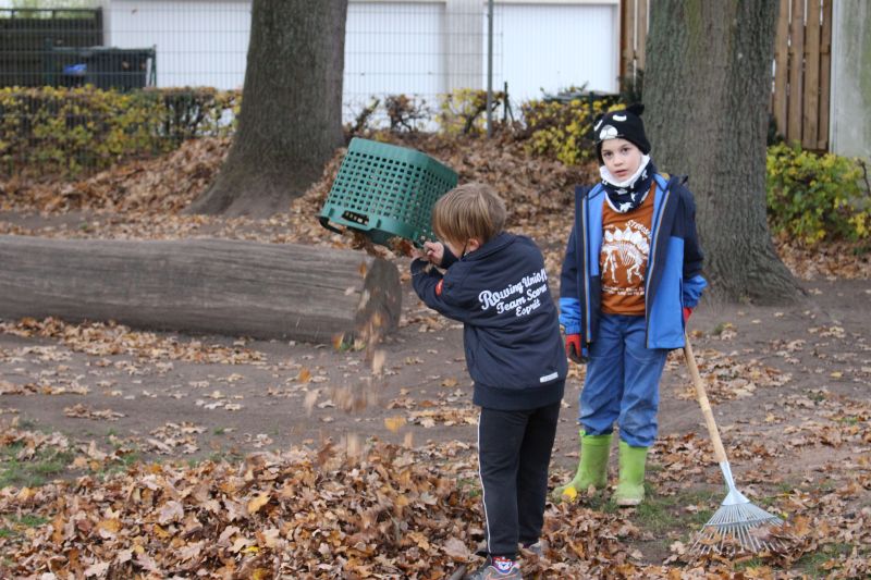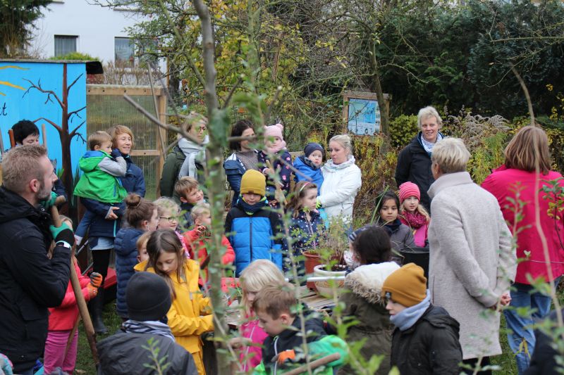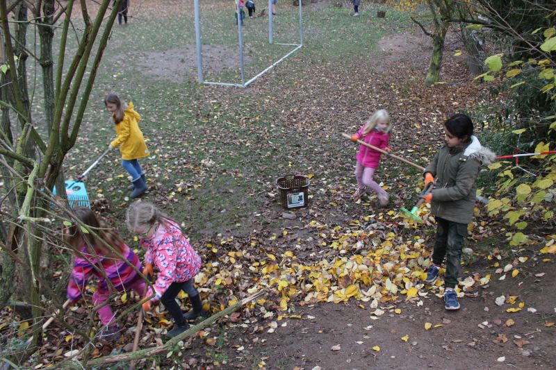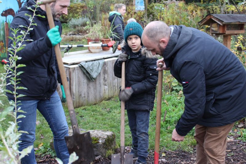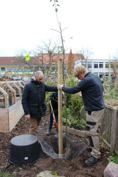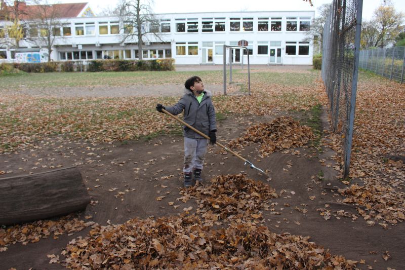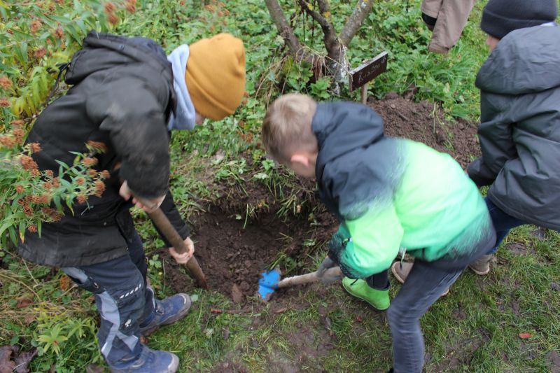 Die Stadt Hameln fragte an, ob unsere Schule Interesse an der Pflanzung und Verwendung von Apfelbäumen im Zuge des Unterrichts hat und daher gerne an dem Projekt „Apfelbäume für Hamelner Schulen“ teilnehmen möchte. An diesem Projekt beteiligt sind außer der Stadt Hameln auch die Stadtwerke und der Rotary Club. Natürlich hatten wir uns gemeldet und freuten uns, als am 19.11. die Apfelbäume geliefert wurden. Mit reichlich Unterstützung des 2. Jahrgangs wurden sie in unserem Schulgarten gepflanzt. Neben der Pflanzung wurde Schulhof und Schulgarten gefegt, geharkt und die Beete mit reichlich Laub winterfest gemacht. Große Freude kam auf, als zur Stärkung Frau Thiel gemeinsam mit ihrem Mann Kartoffelpuffer anbot, angereichert mit Kürbis aus dem Schulgarten. Es war mal wieder eine Aktion mit viel guter Laune. Herzlichen Dank für die Apfelbaumspende und an all die vielen fleißig helfenden Hände.