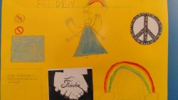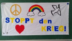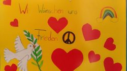 Aus gegebenem Anlass haben wir am Donnerstag, 25. März, in den Klassen einen Aktionstag zum Thema „Frieden“ durchgeführt. Die Kinder konnten erzählen und den Berichten anderer Kinder zuhören. Wir haben versucht über das Thema zu sprechen ohne Kinder zu verunsichern. Die Kinder hatten ein großes Bedürfnis sich zu äußern und ein Zeichen zu setzen.