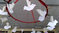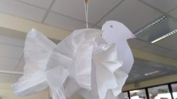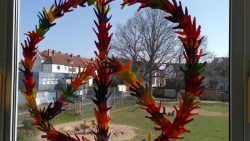 Diesen Abschuss haben wir für das gesamte Bildungshaus gestaltet. Alle Kinder aus KiTa und Schule und alle Erwachsenen, die hier beschäftigt sind, haben sich in einem großen Kreis auf dem Schulhof versammelt und Lieder gesungen. Zuletzt konnten wir zwei Tauben als Friedenszeichen fliegen lassen.